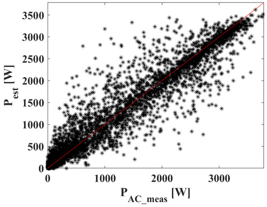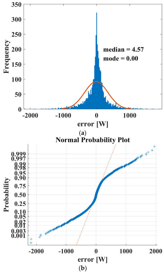 where PPV_meas and Pest are the measured and forecasted values of PAC, respectively; is the mean of the measured values of PAC and M is the total number of considered data. It is important to note that the exclusion of nighttime data, by considering only the period from sunrise to sunset, affects the computed values of the statistical performance metrics, since including zero values would artificially reduce the error between the measured and forecasted data.In addition, visual tools are employed, including scatter plots, error histograms, and normal probability plots, to enable a more comprehensive and nuanced evaluation of forecasting accuracy and bias. This multi-level analysis is particularly relevant for assessing the model’s suitability in market applications, where both the magnitude and the direction of forecast errors can have significant economic implications. - Definition of tolerance bands. Upper and lower tolerance thresholds are established according to regulatory standards, computed as ±α·Pest.
