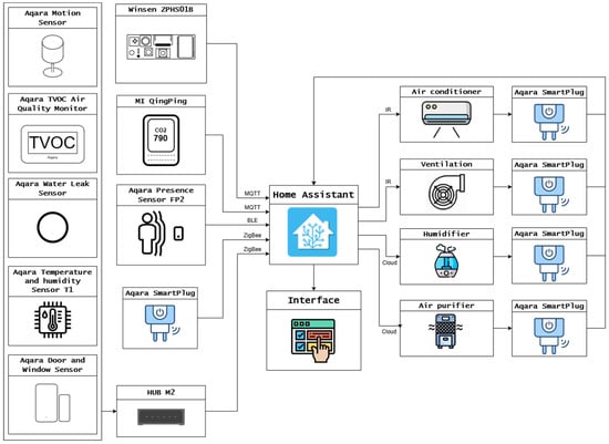 Figure 1 summarizes the cyber–physical layout that underpins data acquisition and automated control in the university smart laboratory. All edge devices appear on the left-hand side of the diagram. Environmental conditions are captured by a heterogeneous cluster of instruments: a Winsen ZPHS01B module and an MI Qingping monitor (Beijing, China) provide measurements of CO2 concentration, particulate matter, temperature, and relative humidity; an Aqara TVOC Air-Quality Monitor refines gaseous-pollutant readings; an Aqara Temperature-and-Humidity T1 sensor augments the thermal field with barometric pressure; and Aqara Motion, Presence FP2, Door/Window and Water-Leak sensors contribute occupancy, safety, and context signals. An additional Aqara Smart Plug is installed at the edge layer (left-center of the figure); although drawn among the sensors, it functions as a metering point for miscellaneous laboratory appliances and is therefore grouped with the sensing infrastructure.
