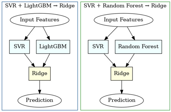 Architectural representation of the SVR + LightGBM → Ridge and SVR + Random Forest → Ridge ensemble models.