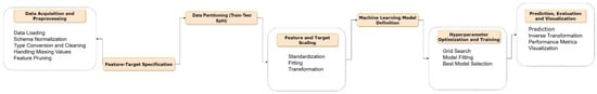 Our predictive modeling pipeline was designed to ensure robustness and reproducibility through a structured, seven-stage workflow, as shown in Figure 3. The process commenced with data acquisition and preprocessing, where the dataset was loaded, and column headers were normalized. All relevant columns were converted to a numeric format, handling inconsistencies like comma decimals, and any rows with missing values were removed to ensure data integrity. Following this, the data were separated into a feature matrix (X) and a target vector (y), representing the energy consumption. To prepare the data for modeling and prevent data leakage, the feature and target variables were scaled using a StandardScaler that was fitted exclusively on the training data. The dataset was then partitioned into an 80% training set and a 20% test set, with a fixed random state for reproducibility. Our modeling approach involved defining and training both baseline models, such as SVR, and advanced stacked ensembles. The stacked model combined heterogeneous base learners (SVR and Random Forest) with a Ridge regressor as the meta-learner to optimally integrate their predictions. Hyperparameter optimization was systematically performed for all models using GridSearchCV with five-fold cross-validation, aiming to maximize the R2 score and identify the best model configuration. Finally, the optimized model was used to make predictions on the unseen test set. These predictions, along with the true test values, were transformed back to their original energy units for a meaningful evaluation. The model’s performance was quantitatively assessed using standard metrics, including MSE, RMSE, MAE, MAPE, and R2, and qualitatively analyzed through visualizations like actual vs. predicted scatter plots to inspect its accuracy and bias. Additionally, SHAP analysis was performed to interpret feature importance, providing insights into how individual environmental variables influenced the model’s energy consumption predictions.