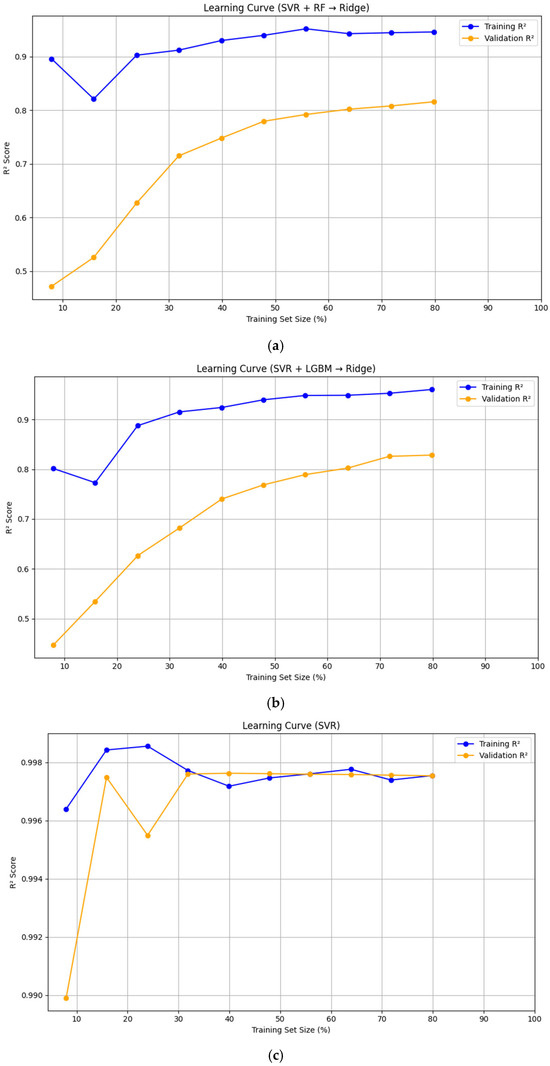 An examination of the learning curves for the four evaluated models reveals important insights into their predictive capabilities and generalization performance, as shown in Figure 4. The two stacked ensemble models—support vector regression combined with Random Forest followed by Ridge regression and support vector regression combined with a light gradient boosting machine followed by Ridge regression—exhibit consistent and desirable learning behavior. For both ensembles, the validation R2 scores increase steadily as the training set size grows and progressively approach the high training R2 scores. This convergence suggests that these models are effectively learning from the data and generalizing well to unseen samples, thereby showing a favorable bias–variance balance. The standalone SVR model achieves near-perfect performance on the training data, with consistent agreement between the validation and training curves, especially after the initial training phase. while the ANN model shows a notable discrepancy between training and validation R2 scores. This pattern is indicative of overfitting, where the model captures the training data intricately but fails to generalize adequately to new data. Collectively, the superiority of the stacked ensemble models is empirically supported by the learning curves. Their balanced performance across training and validation sets highlights their robustness and makes them the most suitable candidates for the target prediction task.