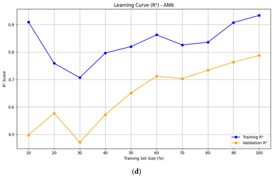 Comparative analysis of learning curves for selected regression model. (a) SVR + RF → Ridge model; (b) SVR + LightGBM → Ridge model; (c) SVR model; (d) ANN model.