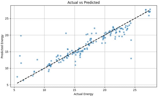 To assess the final performance of our proposed model, we visualized the relationship between the predicted and actual energy consumption values on the test dataset, as shown in the scatter plot in Figure 5. In this plot, the model’s predicted energy consumption (y-axis) is compared against the actual measured values (x-axis), with the dashed diagonal line (y = x) representing a perfect prediction.