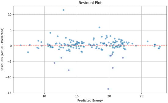 To perform a more in-depth diagnostic evaluation of the SVR + RF → Ridge stacking model, going beyond standard accuracy metrics, we analyzed its residuals. The residual plot, presented in Figure 6, is a critical tool for visually inspecting the model’s performance and validating the core assumptions of regression analysis. In an ideal scenario, the residuals—the differences between actual and predicted energy values—should appear as a random, unstructured cloud of points symmetrically centered around the horizontal zero-error line. Such a pattern signifies that the model has successfully extracted all the systematic information from the data, leaving only unpredictable random noise in its errors.