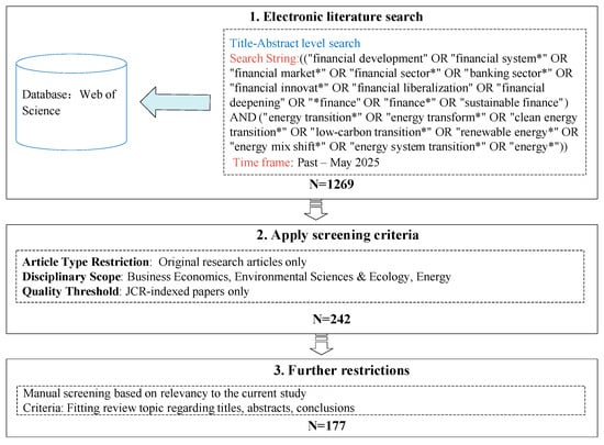To systematically examine research advancements in finance-energy transition nexus, this study employs the Systematic Literature Review (SLR) methodology in 2025. SLR constitutes a rigorous literature evaluation process that follows transparent and reproducible research protocols for objective literature retrieval, quality assessment, and comprehensive synthesis [56]. This study adopts the methodology and procedures established by Kraus et al. [56], which include the following steps: (1) Define search boundaries; (2) Construct Boolean search strings; and (3) Specify temporal coverage parameters. This study retrieved data exclusively from the Web of Science Core Collection database, specifically including the Science Citation Index Expanded (SCI-EXPANDED) and Social Sciences Citation Index (SSCI) sub-databases. To avoid temporal limitations in covering research within this field, we did not apply a sample window and included papers published before May 2025 in our sample. The initial search employed the title keyword combination “financial development” AND “energy transition” to precisely retrieve literature addressing both core domains concurrently, yielding 15 highly relevant papers. To enhance the coverage breadth of the systematic literature review, an expanded search was conducted by broadening the search scope to incorporate the title keyword pair “finance*” AND “energy*”. While this approach may retrieve some marginally relevant studies, it effectively expands the literature pool to reduce the likelihood of overlooking critical research. The specific keyword combination strategies are as follows: ((“financial development” OR “financial system” OR “financial market” OR “financial sector” OR “banking sector” OR “financial innovat” OR “financial liberalization” OR “financial deepening” OR “finance” OR “finance” OR “sustainable finance”) AND (“energy transition” OR “energy transform” OR “clean energy transition” OR “low-carbon transition” OR “renewable energy” OR “energy mix shift” OR “energy system transition” OR “energy*”)). The expanded search yielded 1269 candidate publications.