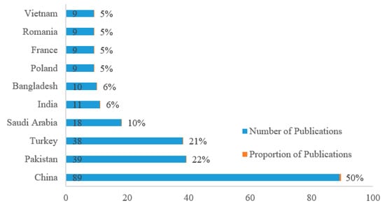 Figure 3 illustrates the annual distribution of articles published in the sampled literature from 2016 to 2025. As demonstrated in Figure 3, the past decade has witnessed a sustained increase in scholarly attention at the nexus of financial development and energy transition, reaching its peak in 2022 with 45 publications. Scholars from China accounted for the largest share (n = 89, 50.0% of total), followed by Pakistan (n = 39) and Turkey (n = 38), each exceeding the 30-article threshold. Figure 4 maps the geographical distribution of researcher contributions at national level.