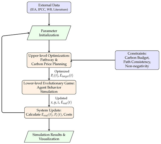 Flowchart of the data processing, upper-level pathway–carbon pricing optimization, and lower-level evolutionary game simulation process.