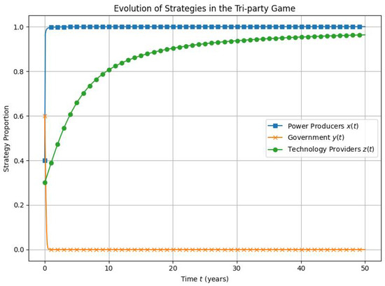 Evolution of strategies in the tri-party game. This figure shows that under the current policy framework and economic parameter settings, there exists an inherent evolutionary drive among the three major agents in the power sector toward a low-carbon transition.