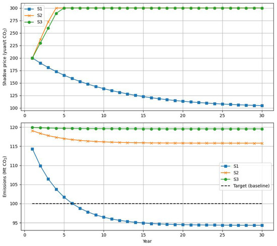 Figure 4 presents the dynamic evolution of both the shadow carbon price and actual emissions across three policy–technology scenarios (S1, S2, S3), each reflecting different levels of technological progress and government support. The upper panel illustrates the trajectory of the shadow carbon price, while the lower panel compares actual emissions against the emission reduction target (dashed line). In the optimistic scenario (S1), where technology adoption and policy incentives are strong, actual emissions decline rapidly over time. Within just a few years, emissions drop below the policy target, demonstrating the effectiveness of coordinated policy support and technological advancement. As the emissions gap closes, the shadow carbon price exhibits a steady downward trend, falling from 200 yuan/t at the outset to just above 100 yuan/t by year 30. This decline reflects a “policy dividend” from early action: once mitigation is on track, price pressure on firms can be relaxed, reducing overall compliance costs and signaling the success of the dual-carbon strategy. In the baseline scenario (S2), which assumes moderate innovation and only partial policy support, the results are less encouraging. Emissions decrease more slowly and plateau above the target level for the entire period. As a result, the shadow carbon price quickly escalates to the policy-imposed ceiling of 300 yuan/t and remains fixed at this maximum. This persistent price cap signals ongoing difficulty in bridging the mitigation gap and points to the risk of cost escalation if technological diffusion stalls or policy design is insufficiently adaptive. The pessimistic scenario (S3), characterized by weak innovation and low incentives, produces the least favorable outcomes. Emissions remain nearly flat, barely deviating from the baseline and failing to approach the target at any stage. The shadow carbon price reaches the upper cap even faster than in S2, reflecting severe policy stress and the system’s inability to generate sufficient behavioral or technological response. This result highlights the limits of price-based mechanisms alone and suggests that under adverse conditions, additional non-market or administrative measures may be necessary to achieve emission reduction goals. Comparing all three scenarios, the analysis underscores that the trajectory and effectiveness of shadow carbon pricing are highly sensitive to the underlying pace of technological progress and the strength of supporting policies. Aggressive early investment in clean technology and robust policy design not only accelerate emission reductions but also allow for a gradual relaxation of carbon price signals, reducing long-term compliance costs. Conversely, weak policy support and technological inertia lead to persistently high carbon prices and missed mitigation targets, raising economic and political challenges for the transition. In summary, these results reinforce the importance of coupling adaptive carbon pricing with proactive technology and policy intervention. Without such alignment, the carbon price will remain high, and the system will struggle to meet ambitious dual carbon targets. The findings provide clear evidence for policymakers: sustained investment in technology, combined with credible and flexible policy frameworks, is essential for an effective, efficient, and politically sustainable low-carbon transition.
