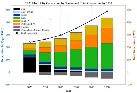 In Australia, a CSIRO forecast (Figure 1) indicates that the transformation of the National Electricity Market (NEM) follows global trends, and it is expected that total generation will increase from 225 TWh in 2025 to 439 TWh in 2050, an increase of 95%. Study have shown rapid growth in RESs, particularly solar PV with an increase of 200% and wind with an increase of 113% by 2050, projecting to reach 64% of variable energy sources by 2030 and 95% by 2050, predominantly from solar PV and wind. The CSIRO forecast projects an exponential growth in dispatchable storage from 10 TWh in 2025 to 75 TWh by 2050, with an increase in capacity of 650%. The BESS growth also follows the RES trends, and the expected dispatchable electricity storage capacity is expected to grow by 6.3 GW in 2023 and 44–96 GW/550–950 GWh by 2050 [,,].