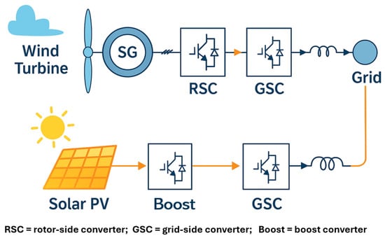 The primary concern is the reduction in system inertia, which is critical to maintaining grid stability during disturbance events []. RESs are inverter-based resources (IBRs), which are not directly connected to the power grid but are behind converters and decouple the RESs from the power systems (Figure 3). This decoupling reduces the natural support provided by the kinetic energy stored in the form of inertia and weakens the power system [,,]. In addition, solar photovoltaic systems do not have a rotating mass and do not provide inertia support. The weak grid with low system inertia introduces a higher rate of change of frequency (RoCoF), lower frequency nadir (the minimum level the frequency reached after a disturbance event), and weakens the damping performance, making grids more susceptible to frequency fluctuations []. The RoCoF (Hz/s) reflects the speed with which the system frequency changes following a disturbance event and indicates the strength of the system. An aggressive RoCoF may not provide sufficient time for under-frequency load shed (UFLS) schemes to operate and poses a risk of system blackouts [].
