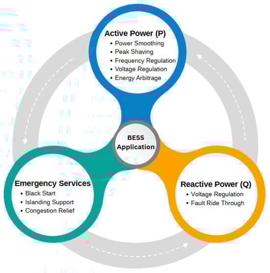 In recent years, technological advancements have positioned the battery energy storage system (BESS) as a viable solution to address emerging security risks of the system. Research on electricity storage technologies has underscored the critical role of BESSs in grid applications []. Compared to alternative technologies, a BESS offers greater flexibility in storage capacity, scalability, and rapid response capabilities, making it an effective solution to enhance grid stability. A BESS provides voltage and frequency control, load following, black start capability, deferral of power line upgrades, and other vital services (Figure 2).