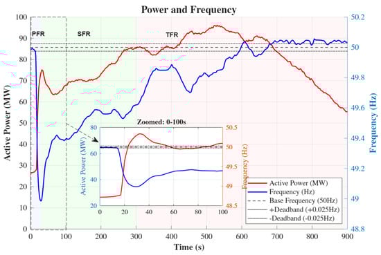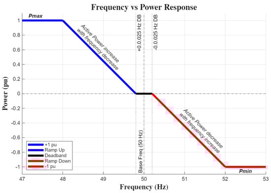 This is the first active control response, typically activated within seconds of a frequency deviation, typically within 30 s, as shown in Figure 5 []. PFR or Frequency Containment Reserve (FCR) resources independently adjust their power output in proportion to the magnitude of the frequency deviation based on the droop settings. The primary goal of the PFR is to arrest the frequency fall or rise outside of the predefined frequency deadbands. This response is generally sustained for several minutes until slower acting reserves, typically the secondary frequency response (SFR), can take over [].