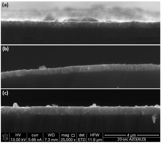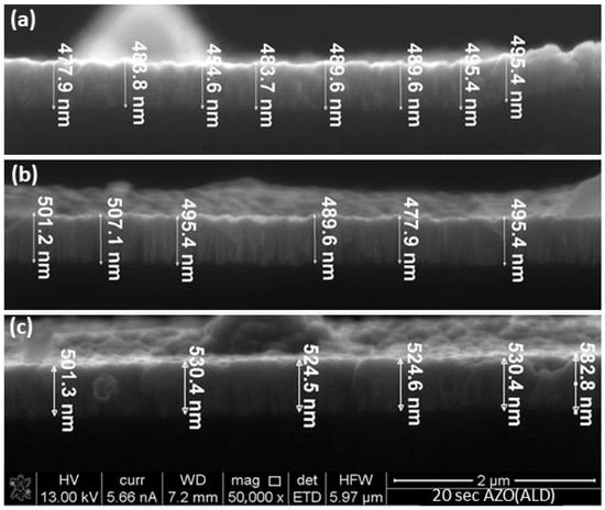 To assess the true thickness of the AZO thin film independently of the underlying silicon nanowire (SiNW) height, a systematic height-profiling analysis on cross-sectional SEM images was performed. After acquiring high-magnification (×50,000) SEM micrographs of each sample (AZO(ALD)-1 in Figure 3a, AZO(ALD)-2 in Figure 3b, AZO(ALD)-3) in Figure 3c), an image analysis software was used to measure the distance from the bottom of SiNW to the outermost AZO surface at multiple locations along the wire array. This approach aids in the AZO contribution by referencing all measurements to an identical height level defined by the bare SiNWs.