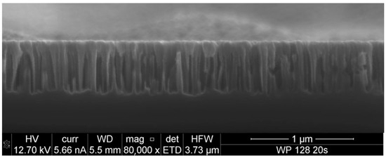 In addition to the atomic layer deposition of AZO films, we extended our study to include magnetron sputtering as an alternative deposition technique. While ALD offers unrivaled conformality and thickness control on high-aspect-ratio nanostructures, its inherently low growth rate and complex precursor chemistry can limit throughput and increase process cost. Magnetron sputtering, by contrast, provides higher deposition rates, simpler precursor handling, and proven scalability in industrial thin-film manufacturing. Moreover, the distinct energy and angular distribution of sputtered species can induce different microstructural features—such as columnar grain growth and enhanced optical scattering—that may prove advantageous for light trapping and charge extraction in tandem photovoltaic architectures. By comparing AZO layers grown by both ALD and magnetron sputtering on identical silicon nanowire scaffolds, we aim to elucidate how the deposition method influences film conformality, electrical conductivity, and interfacial quality, thereby informing optimal process selection for high-performance perovskite/silicon tandem solar cells. Cross-sectional SEM analysis at a 25,000× magnification of samples coated by magnetron sputtering reveals a markedly different coverage morphology compared to ALD-grown films. The results are presented in Figure 4.