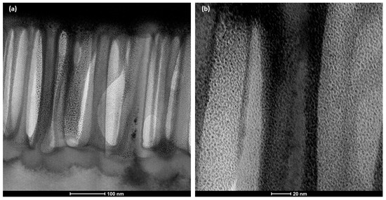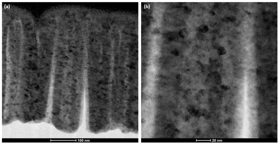 A BF-TEM micrograph of the AZO(MS)-2 layer deposited on a substrate consisting of wires etched in 20 s. (a) 81,000× magnification; (b) 220,000× magnification.