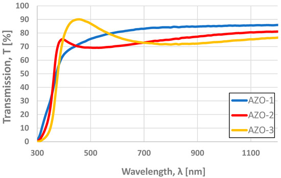 Similarly, the optical transmission of AZO films deposited by magnetron sputtering on glass substrates was evaluated under identical measurement conditions, enabling a direct comparison of the wavelength-dependent transparency and interference behavior imparted by each deposition technique.