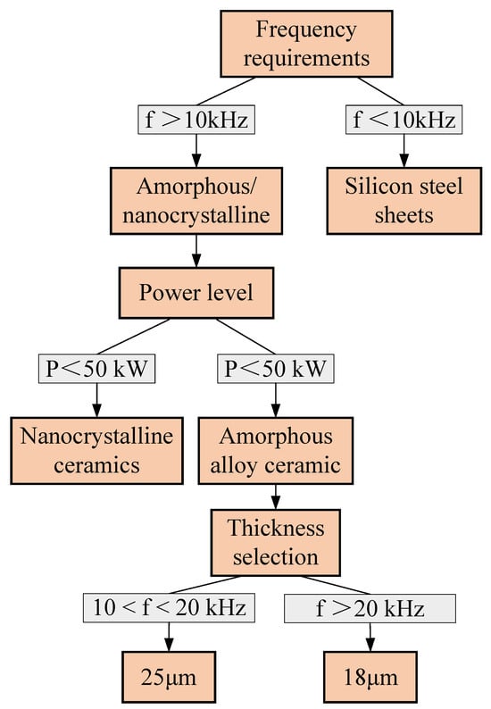 Figure 1 represents the flow chart of optimized core selection for the high-frequency transformation of a smelting transformer. Figure 1 systematically illustrates the decision pathway for selecting the optimal core material in the high-frequency transformation of smelting transformers. Firstly, the application scenarios are classified into two categories of frequency greater than 10 kHz and frequency less than 10 kHz through the determination of frequency demand, where the former is suitable for the selection of amorphous or nanocrystalline materials, and the latter is recommended to be used with silicon steel sheet. At the power class discrimination stage, for applications with power less than 50 kW, nanocrystalline cores are recommended to reduce losses and increase efficiency, while for power more than 50 kW, amorphous alloy cores with good resistance to saturation and lower core losses are recommended. Finally, thickness selection is further subdivided according to frequency requirements, with 25 materials being recommended for applications from f = 10 to 20 kHz, and 18 materials being recommended for frequencies above 20 kHz, to effectively reduce eddy current losses and optimize overall transformer performance.