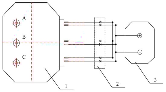 Figure 2 shows a block diagram of the operating principle of the high-frequency DC smelting system, in which “1–3” represent the industrial DC transformer, rectifier cabinet, and DC mineral heat furnace, respectively. The three circular ports A, B and C in the chart generally represent the three-phase conductors in a three-phase electrical system.