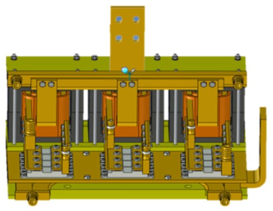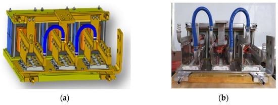 Figure 6 illustrates three-dimensional and physical drawings of the device. They show the actual appearance of the system components and their assembly. The heart of this system is an industrial DC transformer with a power rating of 80 kVA and a design operating frequency of 13 kHz ± 5%. Hitachi-Metglas ® 2605 SA1 (Conway, SC, USA) amorphous alloy was used as the core material, and its size was three-column Φ120 × 80 × 25 mm with a stacking factor of 0.82. By verifying the performance of the system, the measured results show that the no-load loss is 85 W, which is 73% lower than the traditional silicon steel scheme, effectively improving the energy efficiency; the temperature rise is ΔT = 42 K, and the hotspot temperature can reach 67 °C in the case of 25 °C ambient temperature. These features fully reflect the advantages of this DC smelting system in terms of high efficiency and low loss, laying a solid foundation for subsequent practical applications.