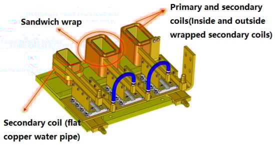 Smelting processes impose demanding high current requirements (typically 10–100 kA), necessitating specialized transformer design. To mitigate current crowding effects and prevent secondary conductor overload, the primary winding employs continuous bifilar construction while the secondary side implements a triple-parallel configuration. Three identical secondary coils are spatially distributed across discrete core limbs, each wound with phase-synchronized parallel conductors to achieve balanced current sharing.