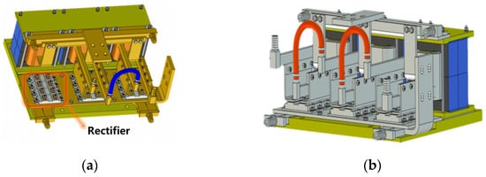 Three-dimensional view of the rectifier and cooling water pipes: (a) highlighting the rectifier bridge and (b) highlighting the display of cooling water pipes.