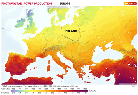 EU countries are shifting from conventional to renewable energy under the European Green Deal, a strategy focused on sustainability, climate action, and environmental protection [3]. The European Commission has proposed legislation to reduce net greenhouse gas emissions by at least 55% by 2030 compared to 1990. These measures aim for climate neutrality by 2050, though implementation may be challenging across member states. Poland, similar to other EU countries, has committed to expanding renewables, especially large-scale photovoltaic plants. Though Poland’s solar radiation is lower than southern Europe’s, favorable conditions and modern technology support efficient PV farm development in central and northern Europe. Equatorial countries receive the highest solar radiation, driving rapid growth in solar power installations recently [4,5,6]. Figure 1 shows the electricity generation potential for European countries (including Poland) using a unit power of PV installations.