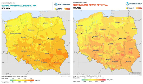 The aim of the analysis was to assess the energy and economic efficiency of a photovoltaic farm that could be installed, in different variants, on the same plot of limited area in central Poland. The region where the photovoltaic power plants are located is characterized by an average level of insolation compared to other parts of the country. The distribution of global horizontal irradiation and photovoltaic power potential in Poland is shown in Figure 2.