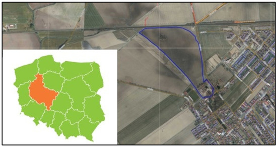 Due to current practical problems with connecting RES installations to the grid in Poland, the availability of land for investment, the desire to shorten the length of cable routes, and the electrical power of the photovoltaic power plant, the appropriate plot for investment was selected near the Plewiska high voltage 400/220/110 kV power station. There is one photovoltaic farm already in operation and another one under construction on the north-east side of the station (Figure 3).