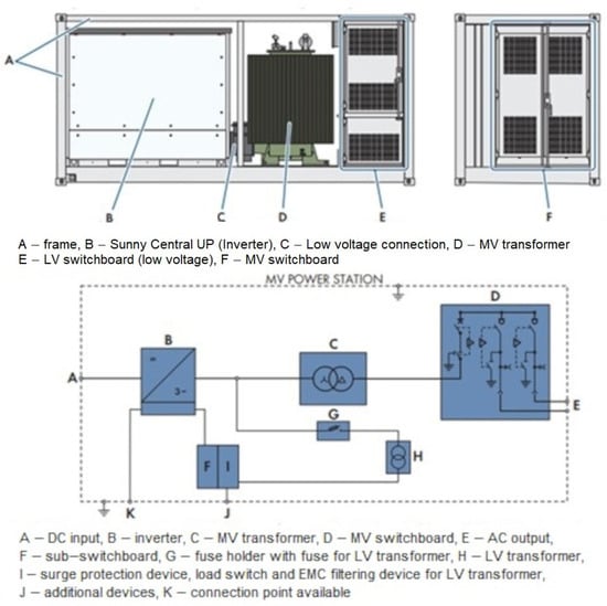 A comprehensive solution integrating the central inverter is an inverter–transformer station. In order to adopt the right solution, a functional analysis of two selected solutions available on the market was carried out. The SMA MVPS station and the Sungrow SG3300/4400UD-MV station were considered. Due to the higher unit rated power of the variable voltage section and the compact solution with predictable parameters, the SMA MVPS 4–4.6 MVA station was adopted. The SMA MVPS inverter–transformer station consists of three main components: the Sunny Central UP central inverter, the LV/MV transformer, and the MV switchgear (Figure 4).