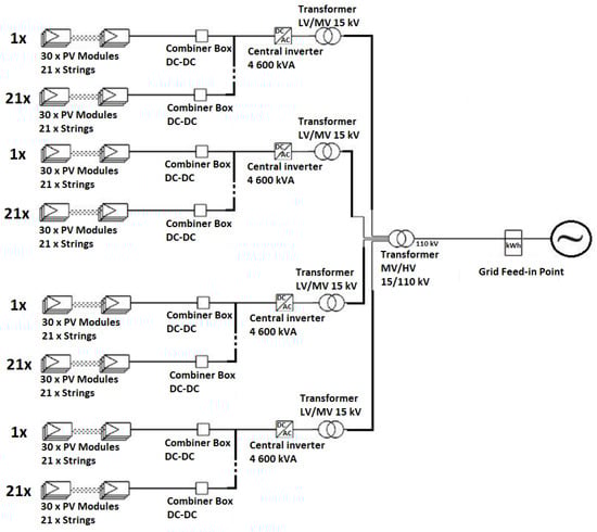 Single-line diagram of a photovoltaic farm with an east–west geographic orientation and a tilt angle of 10°.