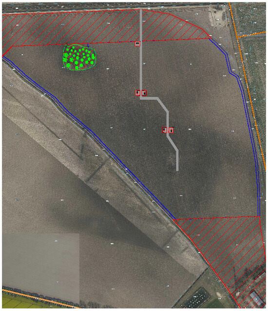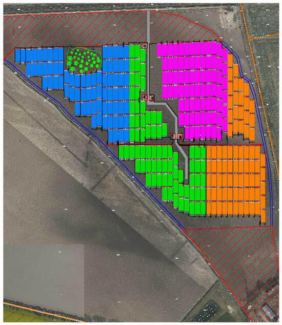 The internal distance between the rows of fixed PV panels is assumed to be 2.5 m, allowing for free access for operation and maintenance by road transport. In order to provide space for cable trenches, areas inaccessible for PV development were designated in the central part of the investment plot in the east–west direction. The analysis assumed one PV table configuration as a three-row one with 30 modules in each row.