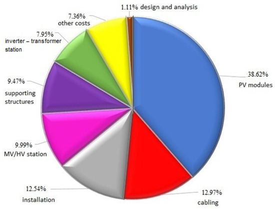 The report presented in 2021 in Poland entitled IEO Photovoltaic Market in Poland 2020 [29] indicates that a 100 kW PV farm requires an investment cost of EUR 82,938. The highest cost of building a photovoltaic farm is the purchase of PV modules, which accounts for 48% of the total investment costs. The second available report [30] highlights more components, such as costs related to the preparation of design documentation (3–5%), cost of purchasing PV modules (40–45%), cost of purchasing a support structure (15–17%), other costs related to the construction of access roads, lighting, and monitoring.