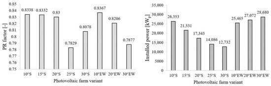 The analysis of the eight photovoltaic farm configurations reveals clear trends in both energy performance and economic efficiency linked to module tilt angle and orientation. Among south-facing variants, the 20° and 30° tilt angles deliver the highest annual energy yields, with production efficiencies of 1123 kWh/kWp and 1132 kWh/kWp, respectively. The Performance Ratio (PR) is also highest for the 20° S variant, reaching approximately 0.83, indicating optimal system operation. However, the installed capacity nearly doubles when the tilt is reduced from 30° to 10° (from 12.7 MWp to 26.3 MWp), as lower tilt angles allow denser module placement due to reduced shading and shorter shadow length, which supports higher land utilization efficiency.