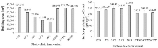 The photovoltaic farm was located on a property with an area of 30.3795 ha, of which the area available for photovoltaic development was approximately equal to 19 ha. The analysis covered the inclination angles of the PV module planes relative to the ground at 10°, 15°, 20°, 25°, 30° for the south-facing farm configuration and 10°, 20°, 30° for the east–west farm configuration.