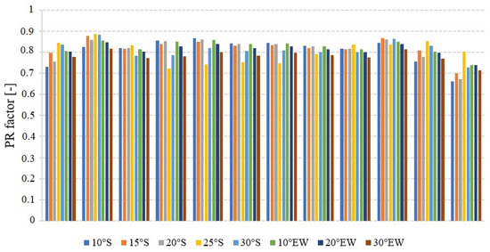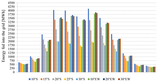From an economic perspective, the 15° S variant offers the most favorable balance, delivering the shortest payback period (8.7 years), highest return on investment (453%), and lowest levelized cost of energy (0.10 EUR/kWh). In contrast, east–west oriented systems, while yielding lower production efficiencies (e.g., 971 kWh/kWp for 10° EW) and longer payback periods (up to 11.3 years for 30° EW), provide smoother, more grid-friendly generation profiles, which can mitigate grid congestion and curtailment risks.