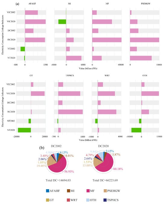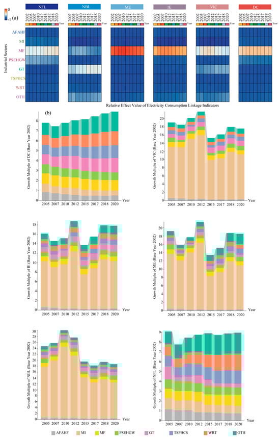 (a) The changes in the relative effect values of electricity consumption linkage indicators for each industrial sector during 2002–2020, namely the changes in the relative importance of different industrial sectors in the linkage analysis; (b) The growth multiple changes in electricity consumption linkage indicators for each industrial sector based on 2002 as the base period, which reflects the temporal evolution of electricity linkage intensity in industrial sectors.