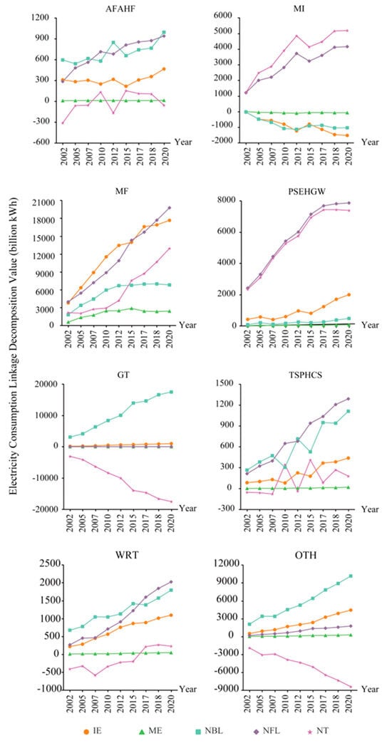 The evolution of mixed effects (MEs) reflects a deepening trend of electricity interaction between industries. The mixed effect of MF increased from 57.866 billion kWh in 2002 to 241.717 billion kWh in 2020, showing significantly higher growth than other sectors. This indicates increasingly close electricity interactions between MF and other sectors. This strengthening of interactive relationships reflects both the deepening of industrial chain division and industrial synergy effects driven by energy conservation and emission reduction policies.