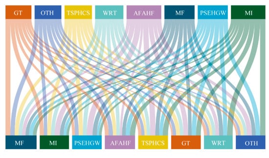 The analysis based on the average path length indicators revealed the transmission network characteristics of electricity influence among China’s industrial sectors, which reflected the transmission efficiency and complexity of electricity influence propagation in the industrial network. As shown in Figure 4, MF demonstrated good transmission accessibility in the electricity influence transmission network. The path length between MF and AFAHF was 2.649, and the path length with the GT industry was 2.656. The moderate transmission paths indicated that changes in MF’s electricity consumption could affect the electricity consumption of these downstream sectors through relatively direct routes. The path length between MF and mining was 2.785, which reflected that electricity influence transmission between the two productive sectors was relatively direct. However, the path length between MF and the power supply industry reached 3.360. The longer transmission path reflected that the impact of electricity consumption changes in productive sectors on energy supply decisions needed to go through complex market and policy intermediary links.