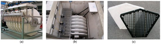 The studied WWTP uses a filter with a maximum capacity of 575 m3/h from Mecana AG [18]—Figure 1. Wastewater is transported from the outlet of the secondary settling tanks to a concrete tank that houses the filter. It consists of 6 disks, each 2.1 m in diameter. The total area is 30 m2 (Figure 1b). Each disk consists of 6 segments individually attached to a rotating shaft that acts as a central filtrate pipe. Each segment is covered with a filter fabric (OptiFiber PES-13, Mecana AG (Reichenburg, Switzerland)) (Figure 1c). The shaft on the outlet side sits on two non-metallic support rollers and one guide roller, and on plain bearings on the inlet side.