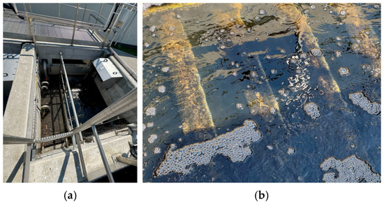 The study was conducted at a wastewater treatment plant (WWTP) located in a coastal town. The treatment plant operates using a standard system for municipal treatment plants, which involves mechanical and biological treatment in the activated sludge process, with the highly efficient removal of nutrients—Enhanced Biological Nutrient Removal (EBNR). Due to its sensitive location (coastal area), the WWTP must maintain the stability of the treated wastewater parameters regardless of the operating conditions. They change due to the high variability in the hydraulic load, especially during the summer season. Table 1 presents the water permit conditions for wastewater quality parameters applicable to the studied WWTP. In 2023, the WWTP was modernized, achieving a maximum capacity of 6000 m3/d and 53,800 p.e. Since then, the studied WWTP’s technological system has been using elements of stage III (high-efficiency nutrient removal using final filtration, Figure 1 and Figure 2a,b) and stage IV (final disinfection of wastewater with UV light) for municipal wastewater treatment, also allowing for wastewater recycling and water recovery.