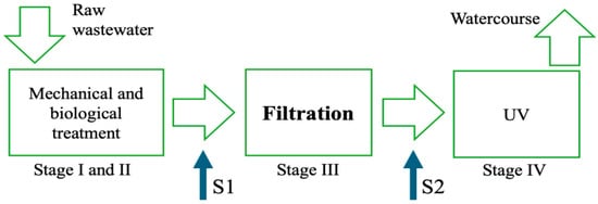 Samples of wastewater treated via mechanical–biological processes (S1, Figure 3) and treated additionally via filtration (S2, Figure 3) were analyzed on site and in the laboratory of the Department of Water, Wastewater and Waste Technology, Koszalin University of Technology. The outcome variable parameters analyzed on site were temperature T [°C], pH, specific conductivity SC [μS/cm], and turbidity TB [NTU]. Other analyses performed in the laboratory were as follows: total suspended solids, TSSs [mg/L] (direct weighing method), chemical oxygen demand, COD [mg/L] (COD Digestion Vials, Low Range, spectrophotometric measurement, Hach Method 8000, Hach (Loveland, CO, USA)), total organic carbon, TOC [mg/L] (Shimadzu TOC/VCPH analyzer with IR detection, Shimadzu (Kyoto, Japan)), orthophosphate, PO4-P [mg/L], ammonium nitrogen, NH4-N [mg/L], and nitrate nitrogen, NO3-N [mg/L] (Hach DR5000 spectrophotometer, Hach (Loveland, CO, USA)).