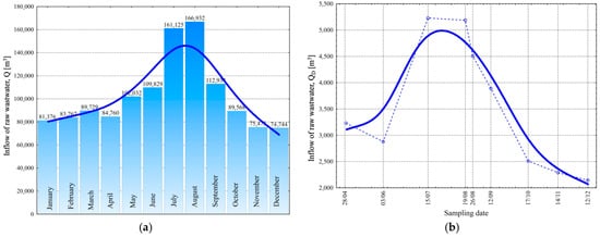 Average monthly wastewater inflows in 2024 (a) and average daily inflows on the test day (b) for the WWTP according to the operator’s data.