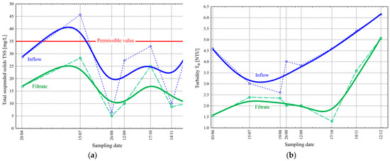 The TSS value in the inflow varied from 6.5 to 45.7 mg/L (mean value = 27.3 mg/L, standard deviation σ = 14.3 mg/L) during the study period. On the other hand, the filtrate changed from 5.0 to 28.3 mg/L ( = 14.9 mg/L and σ = 8.8 mg/L). Wilén et al. achieved a reduction in TSSs to 1 mg/L in their research on cloth filters [19]. The values obtained at the tested WWTP were higher, but still, they were under the limit value resulting from the water permit (Table 1), which is 35 mg/L.