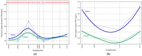 Biological suspended solids retained during filtration consist mainly of activated sludge flocs lifted from the secondary settling tank during final sedimentation. They contain, among other things, organic substances (cellular components of microorganisms), which are detected in indirect analyses of wastewater (chemical oxygen demand, COD) or directly through the value of total organic carbon, TOC [21,22,23]. The analyses revealed that the retention of suspended solids during the filtration process also directly resulted in decreased values of the COD and TOC in the wastewater (Figure 6). The value of the COD in the inflow varied from 21.0 to 73.5 mg/L ( = 34.2 mg/La and σ = 15.5 mg/L) during the study period. On the other hand, the filtrate changed from 18.0 to 57.5 mg/L ( = 29.1 mg/L and σ = 11.8 mg/L) (Figure 6a). In this case, the limit value in the water permit (Table 1) is 125 mg/L. Sun et al. examined a cloth media filter used for treating the effluent of a municipal wastewater plant, achieving an average removal efficiency of 8% for the COD [24]. In the case of the examined WWTP, the COD removal efficiency was 15%.