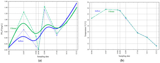Analysis of the values of orthophosphate concentration in the inflow during the study period showed changes ranging from 0.016 to 1.54 mg/L ( = 0.65 mg/L and σ = 0.59 mg/L), while in the filtrate, from 0.016 to 1.43 mg/L ( = 0.76 mg/L and σ = 0.57 mg/L) (Figure 7a). Wilén et al. achieved total phosphorus concentrations below 0.2 mg/L in filtrate from a cloth filter [19]. On the other hand, Sun et al. achieved an average removal efficiency of 28.76% for total phosphorus [24]. Both authors claim to have achieved the removal of phosphorus on cloth filters, which was not the case in our studies conducted in the summer.