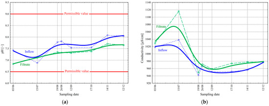 During filtration, physical and biological processes can occur on the filter material [21,22,25,26,28,29]. Biological processes may be the cause of changes in pH and specific conductivity values. The pH value in the inflow ranged from 6.88 to 8.08 ( = 7.64 mg/L and σ = 0.39 mg/L) during the study period, while in the filtrate it changed from 6.84 to 7.71 ( = 7.33 mg/L and σ = 0.27 mg/L) (Figure 8a). The values fell within the permitted range (Table 1). On the other hand, the value of the conductivity in the inflow varied from 942 to 1038 μS/cm ( = 975 μS/cm and σ = 35 μS/cm) during the study period, while in the filtrate, the range was from 945 to 1118 μS/cm ( = 994 μS/cm and σ = 54 μS/cm) (Figure 7b).