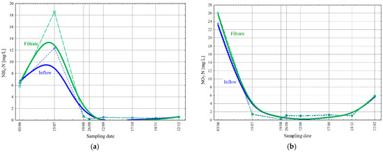 The filtration effect on nitrogen compounds in the wastewater was analyzed for ammonia nitrogen (NH4-N) and nitrate (NO3-N)—Figure 9.