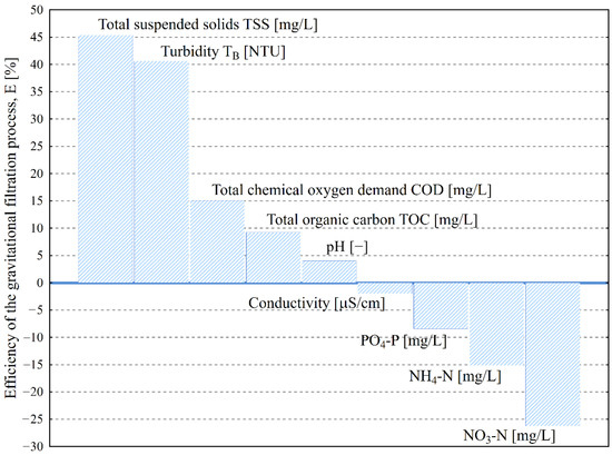 Figure 10 presents the average removal efficiency obtained during research. The highest efficiency of removal was achieved for TSSs and TB, at 45% and 41%, respectively.