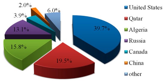 Helium (He) is an indispensable strategic resource in the development of the defense and high-tech industries. It can be used as a propellant and as a pressurizing agent in liquid fuel systems for high-end equipment such as spacecraft and supersonic aircraft, ensuring the system’s normal operation. It can also serve as an essential cryogen in MRI diagnostics, enabling respiratory therapies for asthma patients. In addition, helium plays a critical role in the semiconductor manufacturing process and can considerably improve the performance and quality of semiconductor devices. The distribution of global helium resources is extremely uneven, however, and the stability and sustainability of its supply have attracted widespread attention from the international community. Currently, the total amount of helium resources in the world has reached about 51.9 billion cubic meters, mainly distributed in the United States, Qatar, Algeria, Russia, and Canada, which account for 39.7%, 19.5%, 15.8%, 13.1%, and 3.9% of the total resources, respectively. The helium resources in China are in short supply, accounting for only 2% of this total [,] (Figure 1).